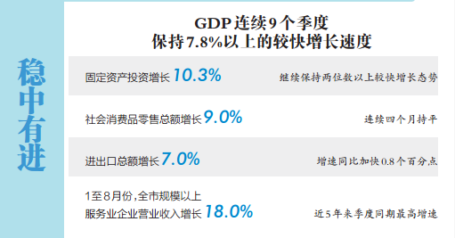 市统计局表示,前三季度,全市生产总值(GDP)比上年同期增长7.8%,增速高全国1.6个百分点,与全省持平。GDP连续9个季度保持7.8%以上的较快增长速度。