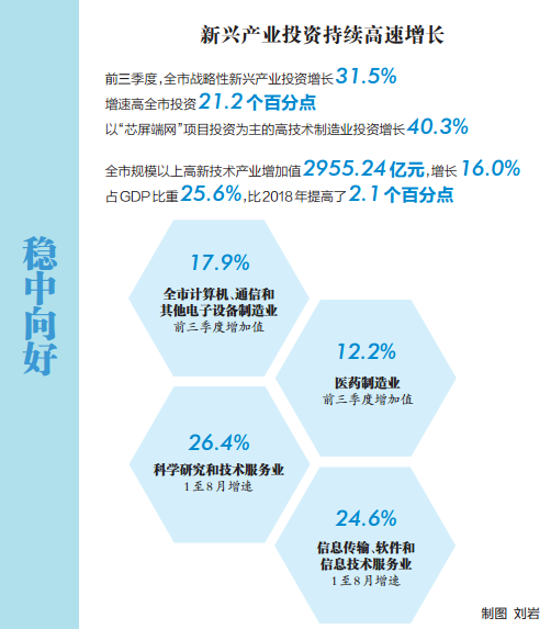 新兴产业加快成长,前三季度,全市计算机、通信和其他电子设备制造业、医药制造业增加值分别增长17.9%和12.2%,增速分别同比加快8.1和2.7个百分点。以新技术为引领的相关服务业营业收入保持较快增长,1至8月,科学研究和技术服务业,信息传输、软件和信息技术服务业增速分别达到26.4%、24.6%,拉动全部规上服务业营业收入增长9.0个百分点。