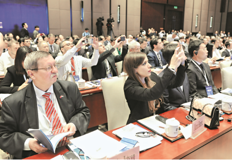 5月29日,武汉国际经贸交流合作大会现场。来自23个国家和地区的400多名世界500强及全球知名企业高管、境外商协会高层、政府机构及武汉本地企业代表参加了会议