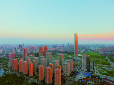 绚丽晚霞中,武汉中央商务区高楼林立 胡冬冬 摄