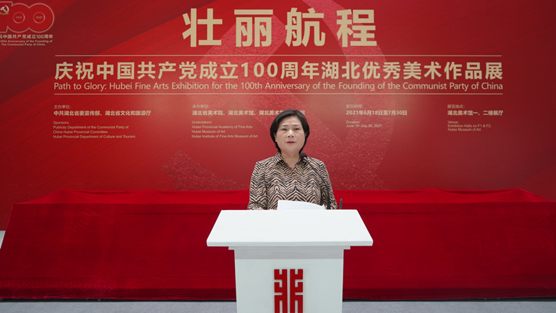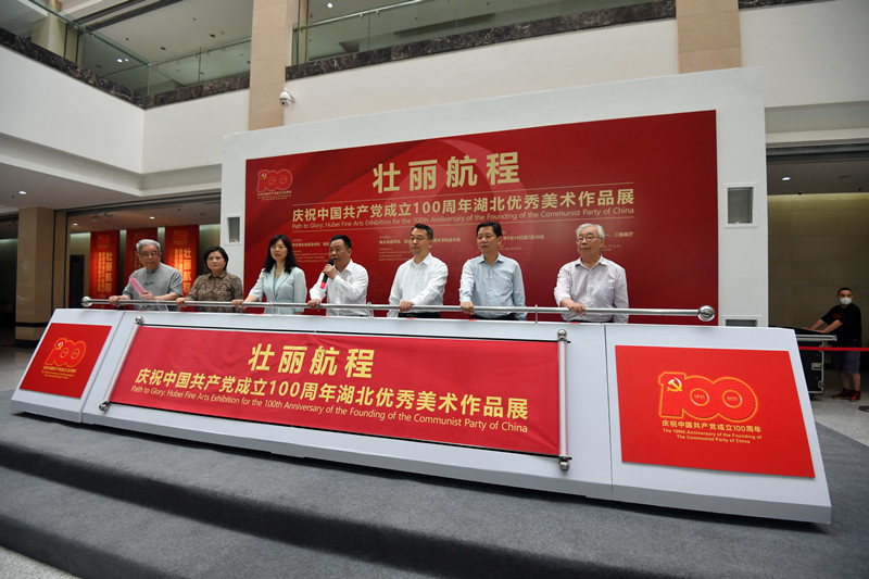 6月18日,“壮丽航程——庆祝中国共产党成立100周年湖北优秀美术作品展”在湖北美术馆开幕。省委常委、宣传部部长许正中宣布展览开幕,副省长张文兵出席开幕式,并与艺术家代表一同为展览揭幕。中国美术馆馆长吴为山发来贺信,著名艺术家唐小禾、陈立言与业内外嘉宾和游客代表200余人一同参加开幕式并观看展览。