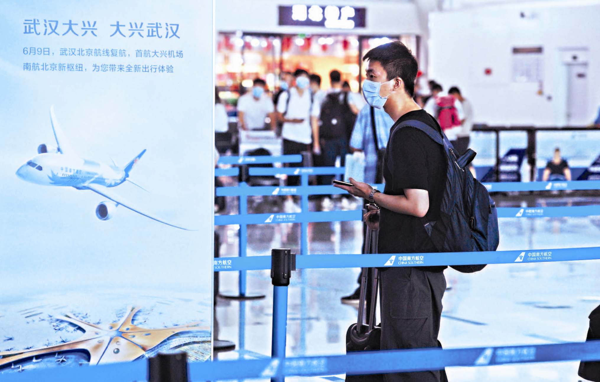 6月9日15:55,搭载着34名旅客的南航CZ3139航班从武汉天河机场腾空而起,飞往北京大兴国际机场。这是疫情发生以来武汉恢复运行的首个至北京的客运正班航班,标志着武汉往返北京客运航线正式复航。东航武汉公司也将在6月11日推出武汉往返北京航班。武汉赴京旅客注意,要提供核酸检测阴性证明。