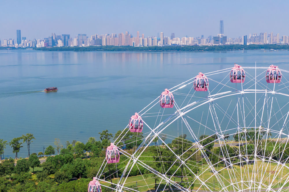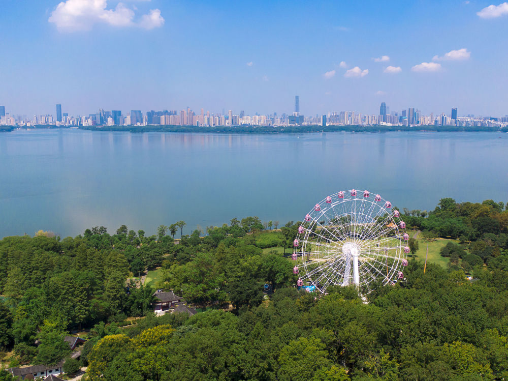 ↑2020年8月17日拍摄的武汉“东湖之眼”摩天轮(无人机照片)。新华社记者 熊琦 摄