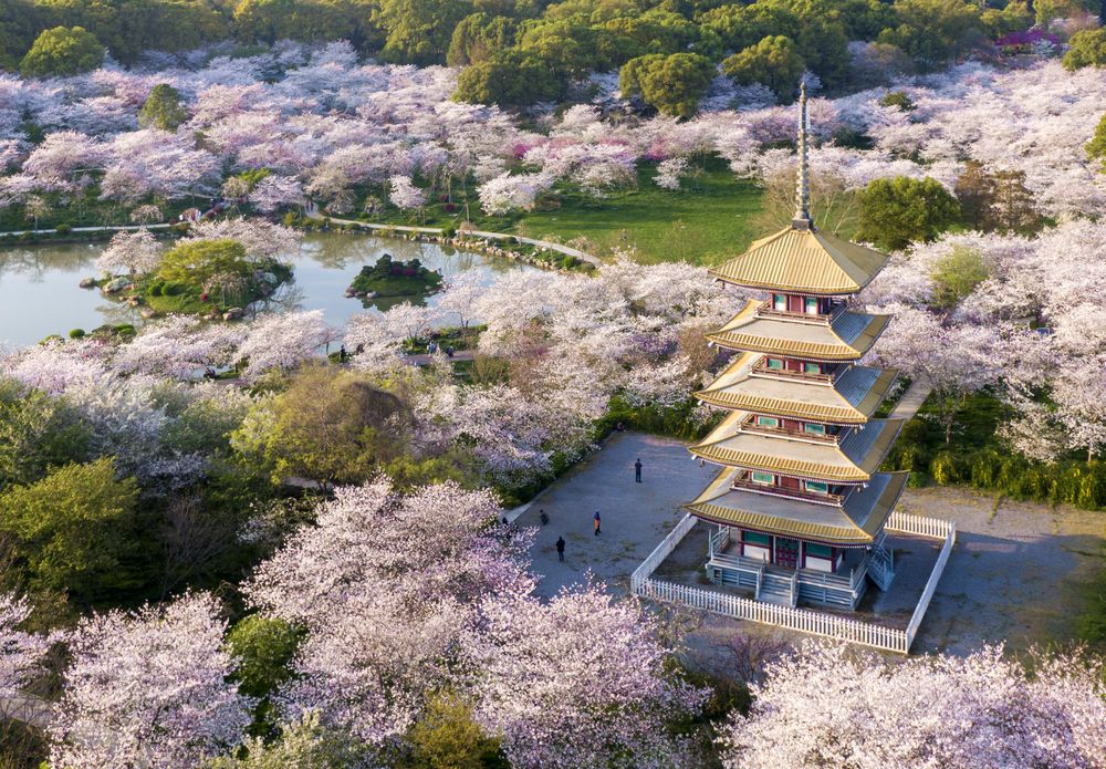 ↑2020年3月20日拍摄的武汉东湖樱园(无人机照片)。新华社记者 熊琦 摄