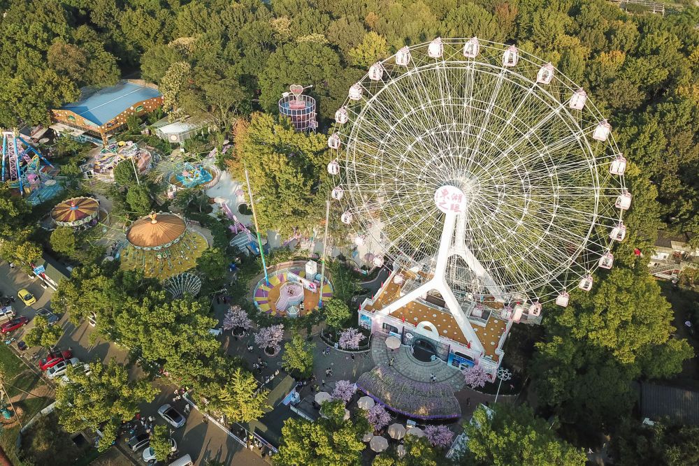 ↑10月4日拍摄的武汉市东湖磨山景区“东湖之眼”摩天轮(无人机照片)。新华社发(伍志尊摄)