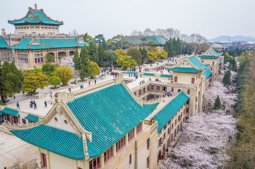 ↑3月13日,武汉大学举行抗疫医护人员赏樱专场(无人机照片)。新华社记者 肖艺九 摄