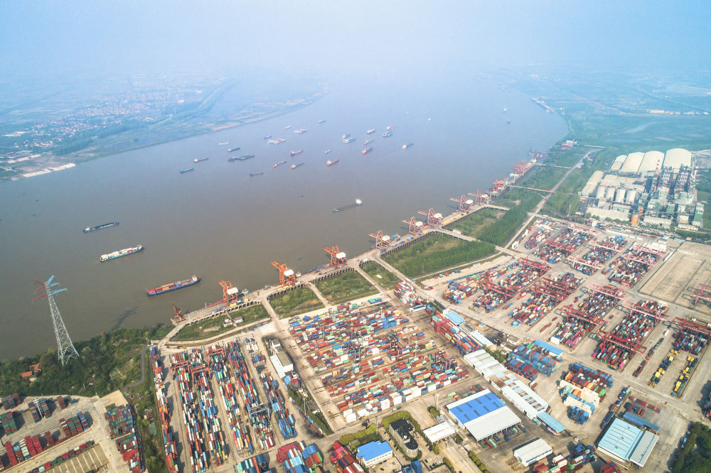 ↑2020年4月12日拍摄的武汉长江中游航运中心核心港阳逻港(无人机照片)。新华社记者 肖艺九 摄