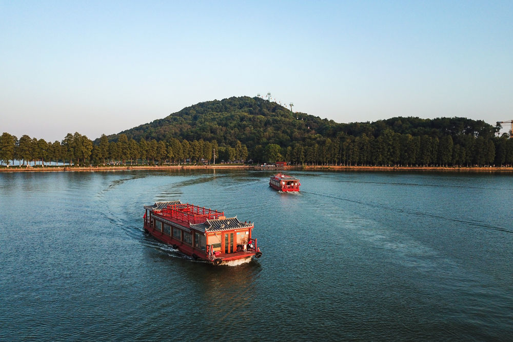 ↑10月4日,游客们在武汉市东湖景区乘坐湖景观光船(无人机照片)。新华社发(伍志尊摄)
