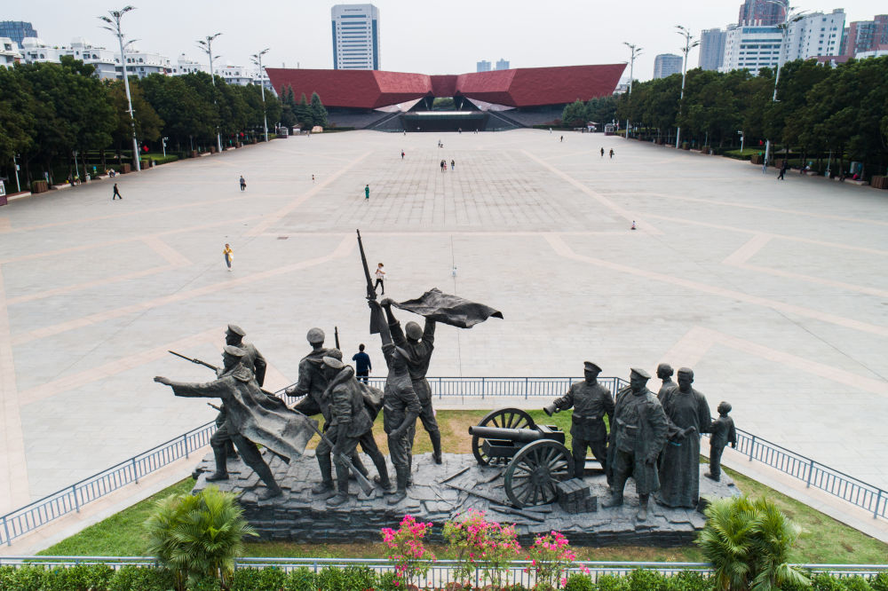 ↑这是10月9日拍摄的位于武汉市武昌区的“走向共和”群雕(无人机照片)。新华社发(伍志尊摄)