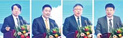 中国科学院院士黄维、银帝集团董事长朱奕龙、哈药慈航制药股份有限公司董事长段燕文、武汉梦芯科技有限公司董事长韩绍伟(从左至右),分别在华创会武汉论坛上发言。长江日报记者詹松 摄