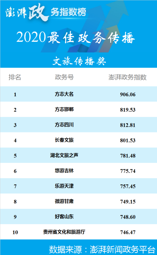 2021年1月12日,澎湃新闻发布政务指数2020年度“最佳政务传播奖”榜单,“方志大名”澎湃号、“方志邯郸”澎湃号、“方志四川”荣登“澎湃新闻·文旅传播奖”前三名。