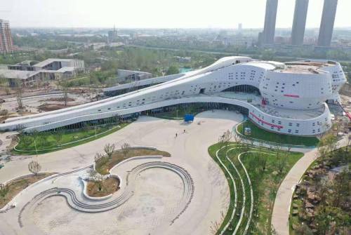 国家方志馆南水北调分馆位于南水北调焦作城区段总干渠入城拐角处,建筑总面积约4万平方米,总投资6亿元。造型设计灵感来自成语“水到渠成”,外观以水为形、以南水北调渠道为意,简洁流畅、灵动时尚、活力绽放,俯视整个建筑为“如意”形状。该馆设置室内、室外两个展陈空间,室内展陈包含序厅、基本陈列厅以及故乡之水、和谐征迁、复兴之水三个专题展厅;室外展陈主要有穿黄工程盾构机、提槽机、衬砌机及其他大型施工机械等。