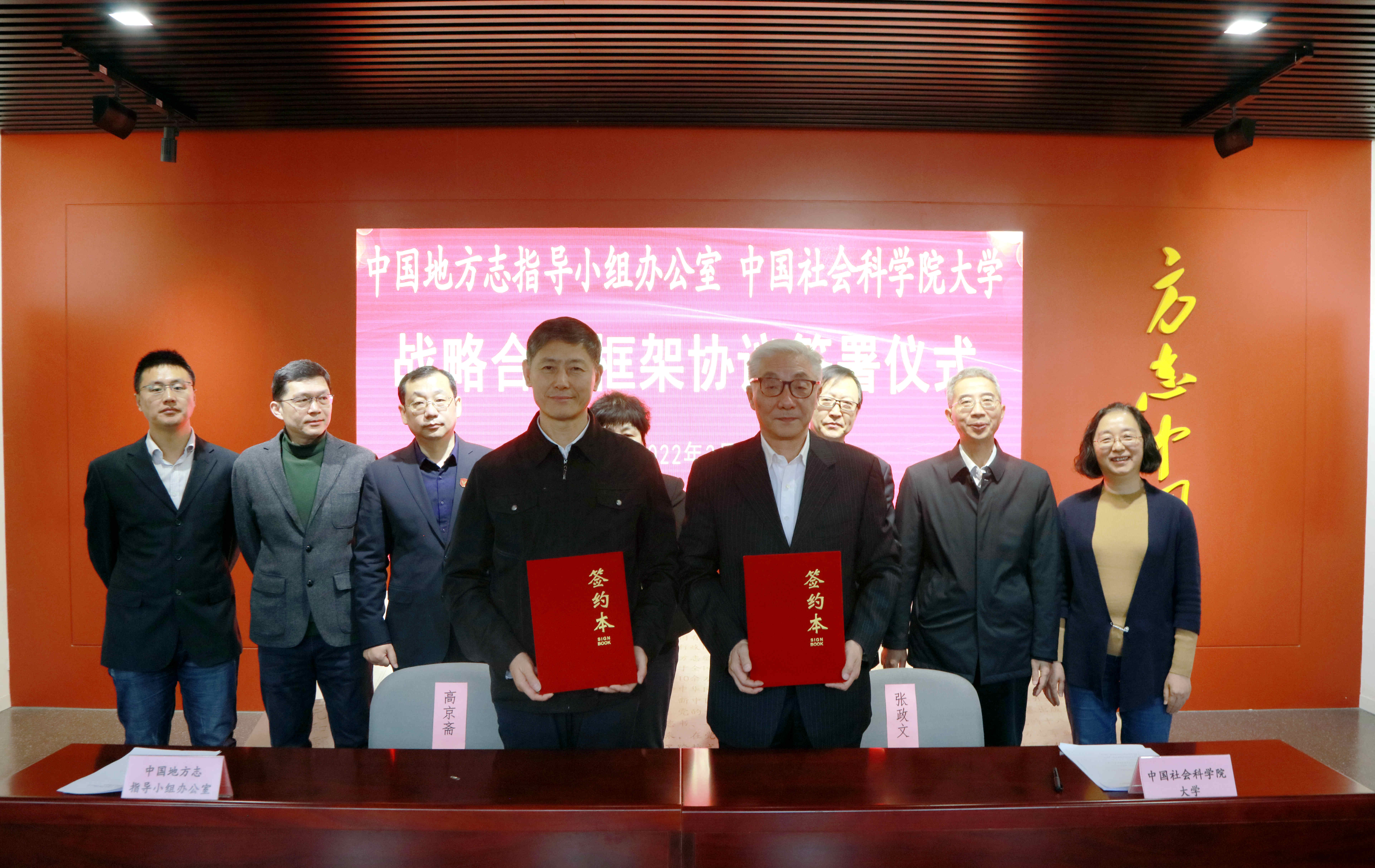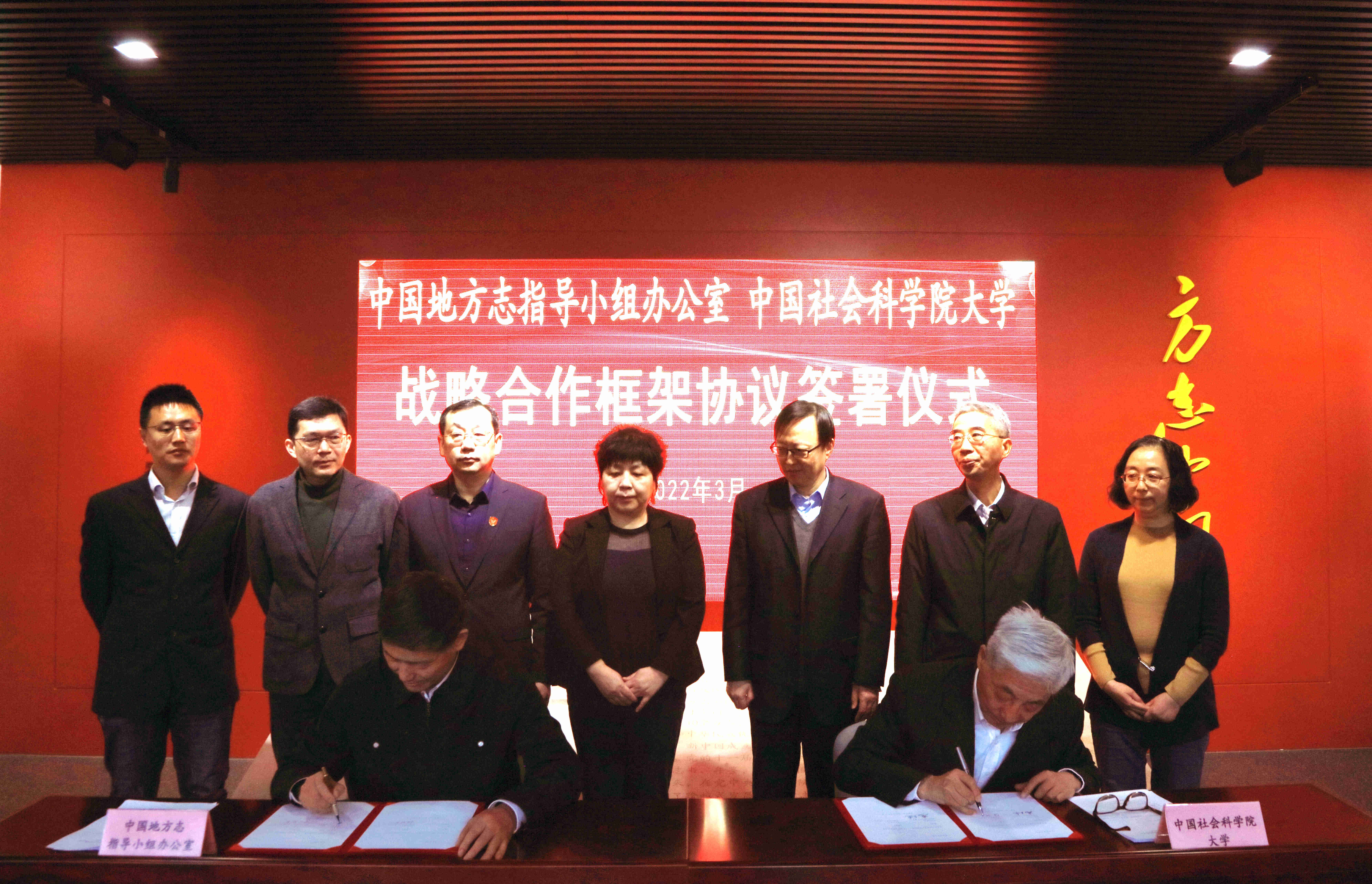 2022年3月17日,中国地方志指导小组办公室(以下简称中指办)、中国社会科学院大学(以下简称社科大)战略合作框架协议签署仪式在国家方志馆举行。中指办党组书记、方志出版社社长高京斋,社科大党委常务副书记、校长张政文致辞并签署战略合作协议。社科大党委常委、副校长张波、张斌,社科大历史学院党总支书记兼常务副院长闫雷,副院长袁宝龙,中指办党组成员、方志出版社总编辑曹宏举,中指办一级巡视员邱新立出席。中指办纪检组组长、副主任叶聪岚主持签约仪式。