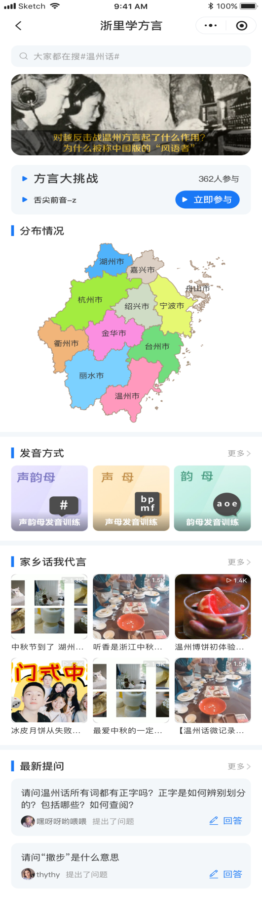 以“浙里学方言”小场景为例,该场景主要以《浙江通志·方言卷》为基础资料,除了从语料学的角度科学详细的介绍浙江方言的分布情况和发音方式,还引入全省实地采录的各地方言音频,从“吴侬软语”的浙北方言,到号称“全国最难懂方言排行榜第一”的温州话,详细科普浙江方言的南北差异。同时,还通过“方言大挑战”“家乡话我代言”等互动栏目,让更多的人,尤其是青年人“知家乡、爱家乡”。