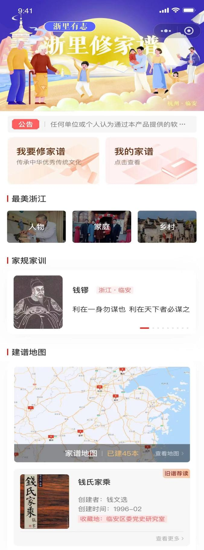 杭州市临安区地方志办公室打造“浙里修家谱”小场景,除了提供家谱的在线协作编修功能,让群众能参与修谱工作,打造自己家族的“人物传”外,还结合GIS等技术,将家谱信息从时间和空间两个维度进行展示,提供寻根问祖、人物关系查询等功能,并可视化展示家族迁徙过程等。同时还和文明办、妇联等有关单位协同共享数据,与“浙里好家庭”“浙里好家风”等应用联动,进一步宣扬好家风、好传承。