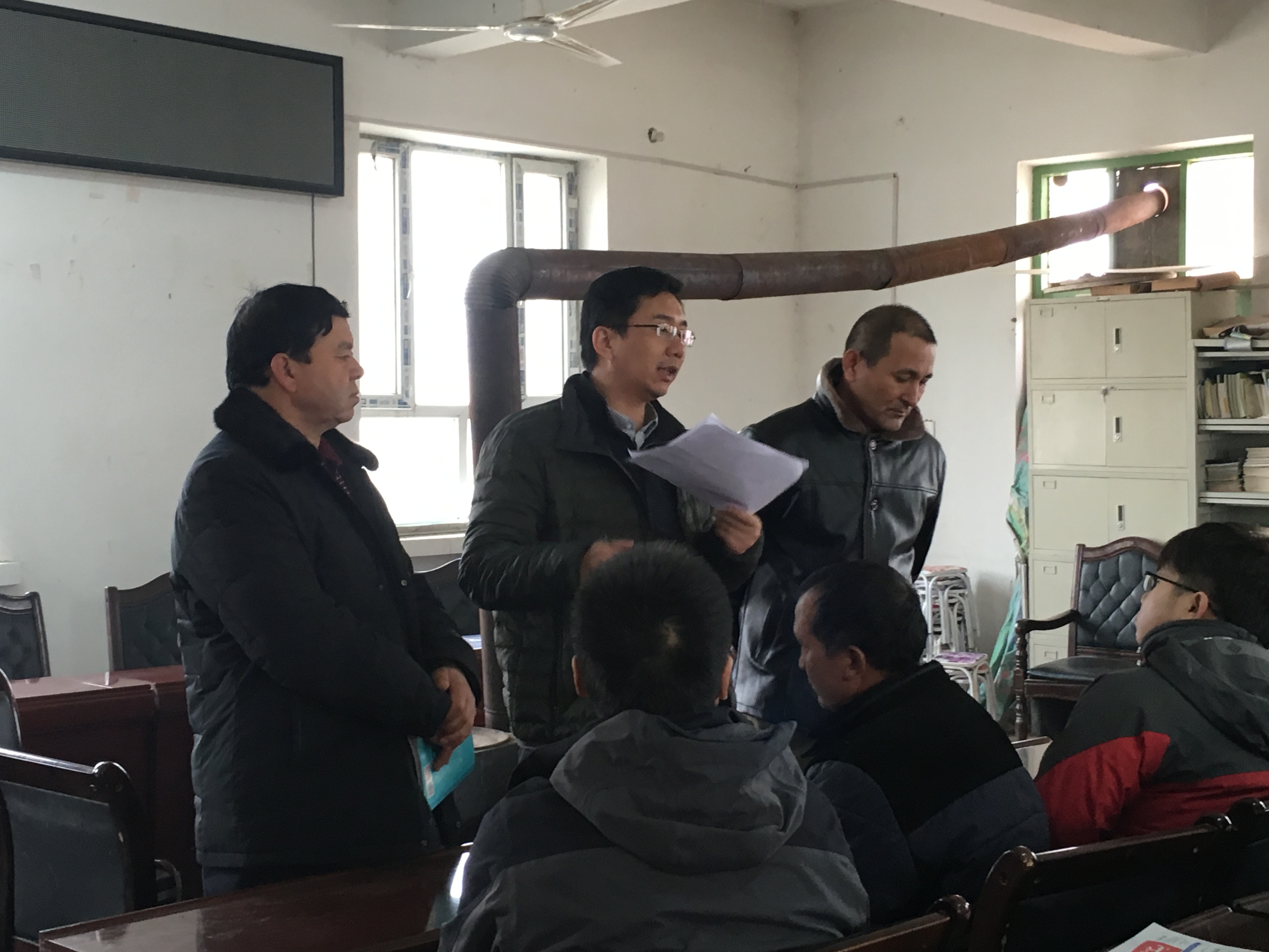 ▲2017年12月,陈旭(图中左二)在兵团第三师图木舒克市49团十连为基层职工讲党课。新疆生产建设兵团党委党史研究室(兵团志办公室)/供图
