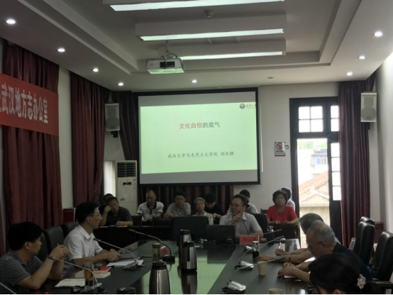 2019年7月4日,武汉地方志办公室举办市委讲师团点单宣讲暨“学习英雄张富清、坚守初心担使命”专题“支部主题党日”活动。市委讲师团成员、武汉大学马克思主义学院副教授刘水静以“文化何以自信:当代中国文化自信的本质与底气”为主题进行宣讲。志办党组成员、副主任王勇祥主持,全体党员干部职工及部分离退休党员参加活动。