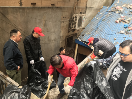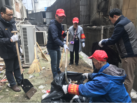 2019年3月29日上午,武汉地方志办公室志愿服务队员在江汉二路119号楼背后清扫卫生