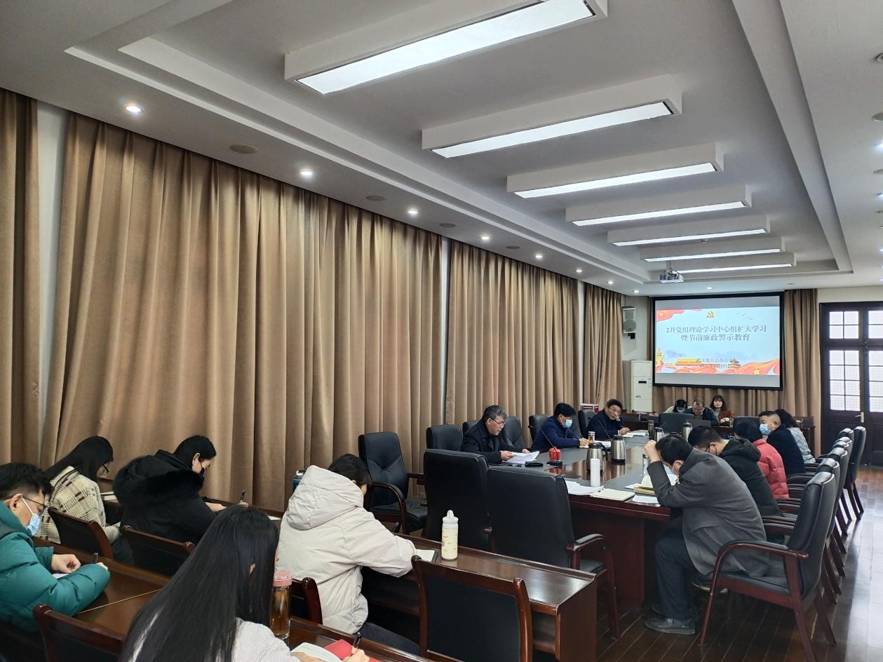2021年2月10日上午,武汉地方志办公室组织开展2月党组理论学习中心组扩大学习暨节前廉政警示教育。机关党委书记程鹏主持学习,党组成员、处室负责人、其他干部职工参加。