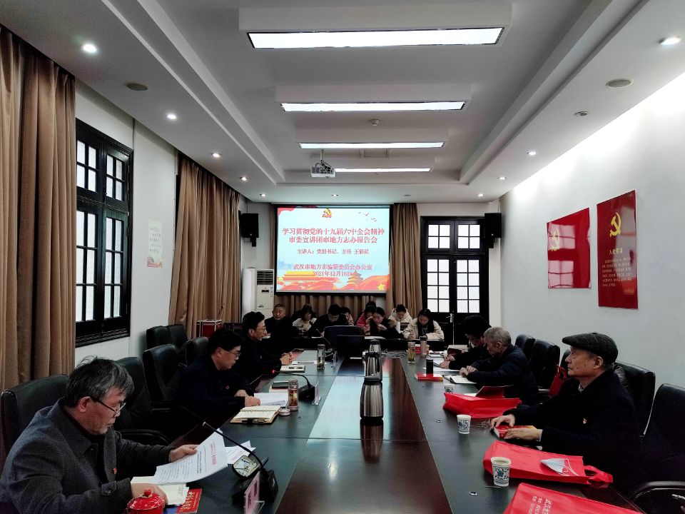 2021年12月16日,武汉市地方志编纂委员会办公室举行学习贯彻党的十九届六中全会精神宣讲报告会。市地方志办党组书记、主任王筱武向全体干部职工和机关老干部支部党员作宣讲报告。