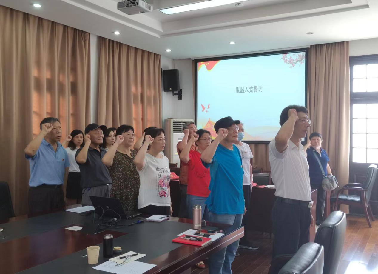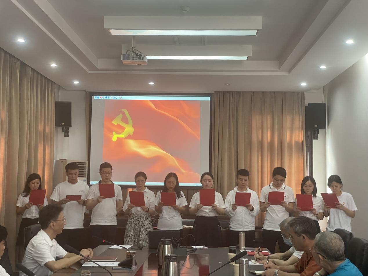 仪式在雄壮的国歌声音中拉开帷幕。随后,全体党员面向鲜红党旗,重温入党誓词。青年读书会成员激情朗诵诗歌《党旗颂》,庆祝中国共产党101周年华诞。