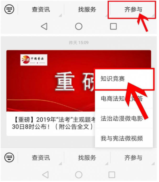 2、进入中国普法微信主页面,点击下方子菜单“齐参与”图标;